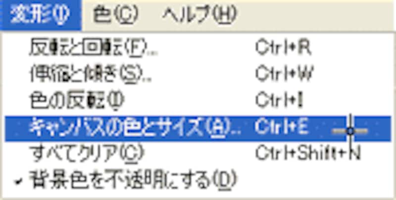ここで一度、メニューバーの[変形]→[キャンバスの色とサイズ]で、画像の大きさ(ピクセル寸法)を確認しておきます。