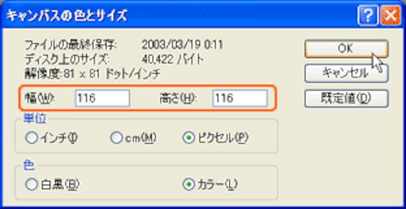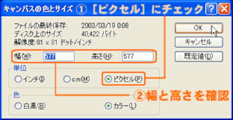 単位の[ピクセル]にチェックを入れ、幅および高さを確認します。