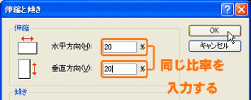 | このままの大きさでアイコン保存しても、サイズはかなり大きいままなので、ここでとりあえず絵を縮小しておきます。[伸縮と傾き]で、水平、垂直方向ともに縮小(ここでは20%)し、[OK]ボタンをクリックします。 |