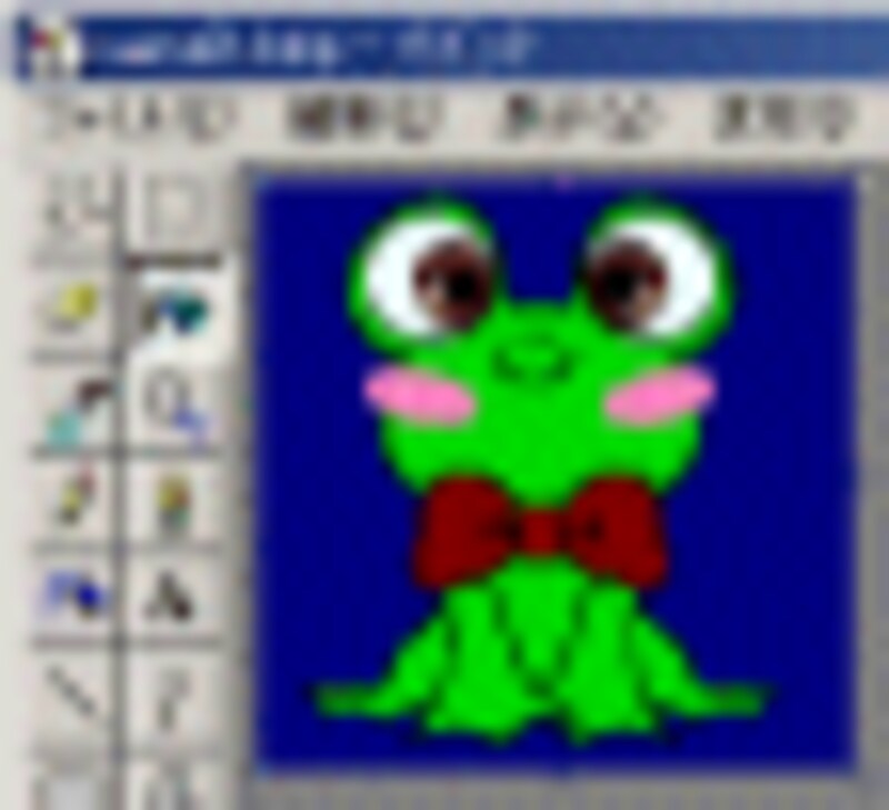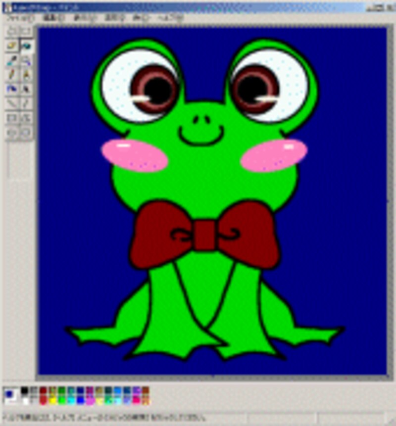 まず「ペイント」を起動して、「塗りつぶしでキャラ着色もたのし 」で作成したキャラクターを開きます。前回と同様に、正方形のキャンバスにしたものに、カエルに使用していない色で、背景を塗りつぶします。 |