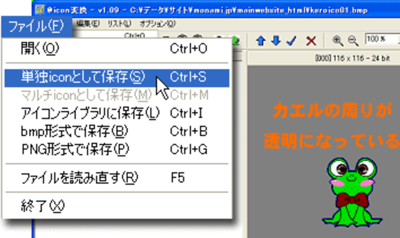 カエルの周りがきれいに透過されていることを確認しましたら、[ファイル]→[単独iconとして保存]を選択します。