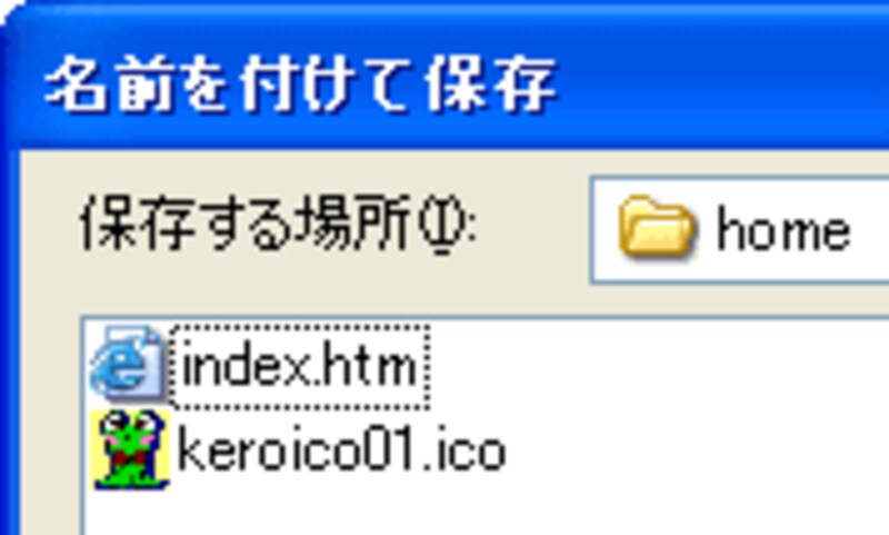 | このタグの"kaeruico.ico"部分は、さきほど保存した「*.ico」ファイル名を入れます。今回の場合は、「keroico01.ico」と表記していますが、これは任意のアイコンファイル名によって変えます。 | |