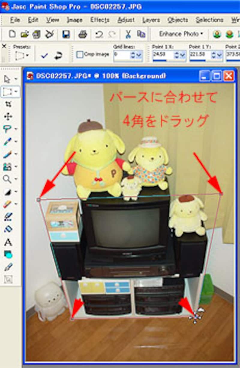 「遠近補正ツール」の使い方はいたって簡単です。視点の手前の方が大きく(広く)、遠くなるほど小さく(狭まって)見えるというのが遠近法ですが、このパースにのっとった対象物を枠で囲み、