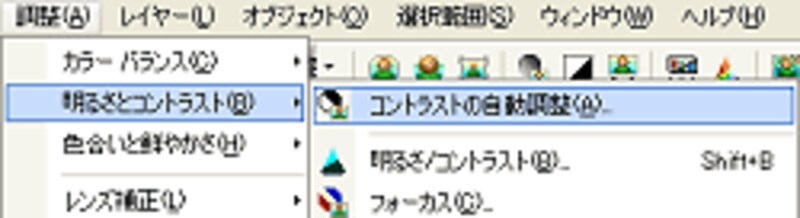 そこでまず画像全体の明るさとコントラストを、[コントラストの自動調整]でバランス良く修復してみます。