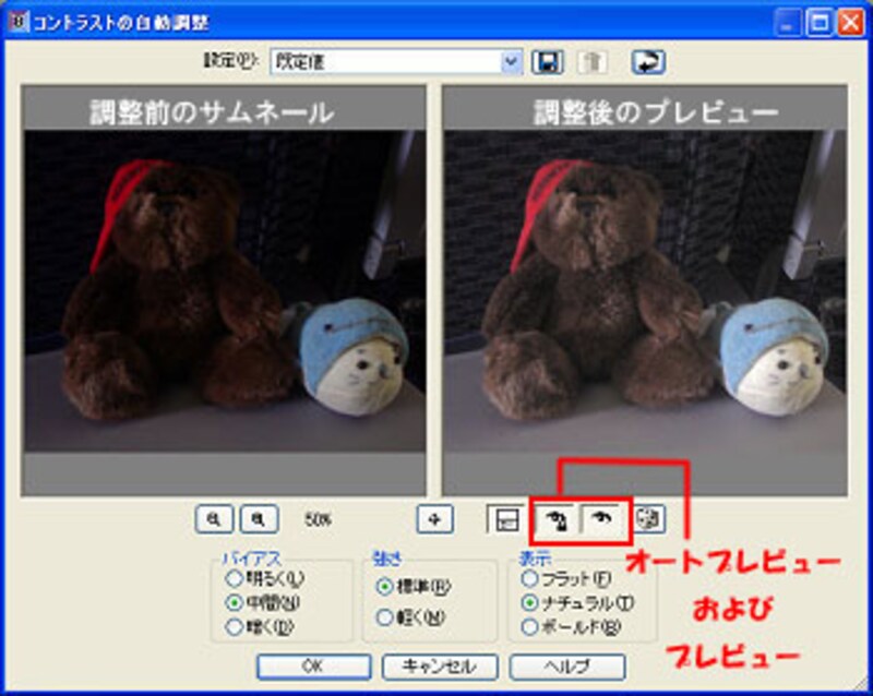 メニューの[調整]→[明るさとコントラスト]→[コントラストの自動調整]を開いた初期状態です。[オートプレビュー]と[プレビュー]ボタンを押して左右のサムネールで確認してみると、中間の明るさの部分が多少はっきりしているものの全体的に明るさが弱いようです。