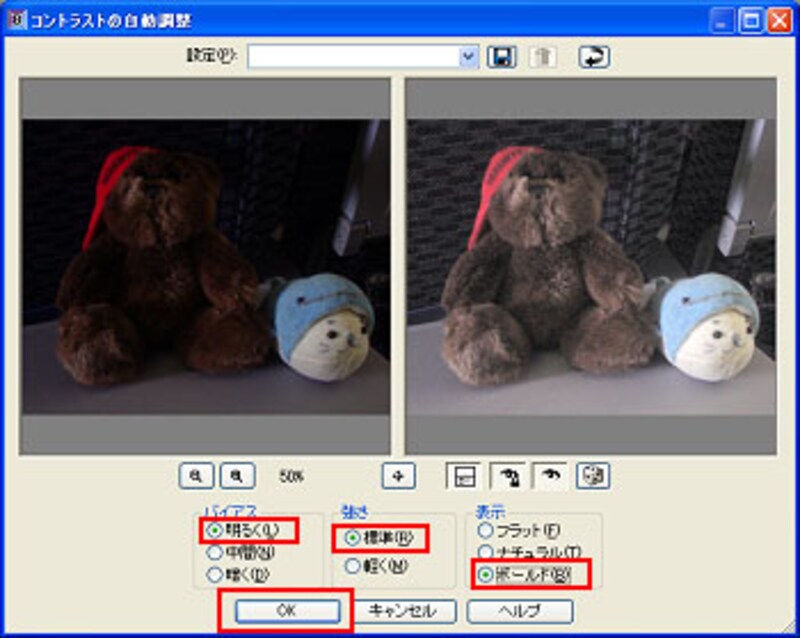 そこで、明るさを強調するために[バイアス]を[明るく]に、[表示]を[ボールド]に変更してみます。明るい部分がかなりはっきりして、左のぬいぐるみの詳細が見えてきました。
