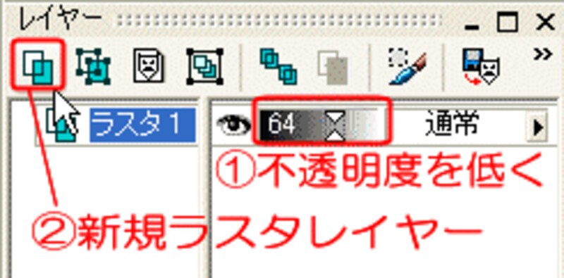 これで不透明度の調節が可能になりますので、(1)のスライダを左にドラッグして不透明度を低くします。下絵が透けてきます。続いて(2)のボタンをクリックして新規ラスタレイヤーを追加します。