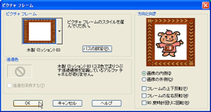 ピクチャフレームのボックスをクリックすると、さまざまな種類のスタイルのサムネールが表示されます。好きなフレームを選び、画像の内側に囲むか、外側に囲むかを選択して、[OK]ボタンをクリックして確定させます。
