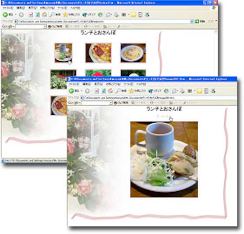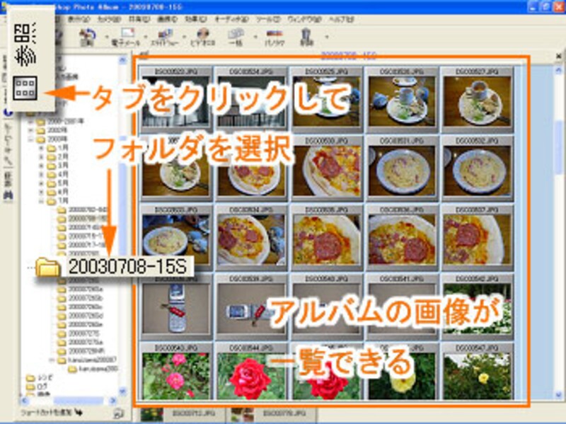 たとえばハードディスクに保存してあるデジカメ画像の、お気に入りの画像だけを集めてアルバムをひとつ作ることにします。作るといっても、このソフトでは、画像フォルダ自体をアルバムとして扱うので、[参照]タブをクリックして、目的の画像フォルダをクリックするだけです、右側にはアルバム内の画像が表示され、確認できます。