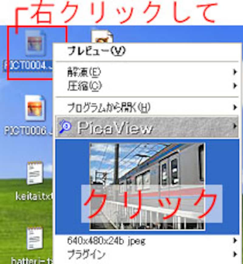 たとえばデスクトップ上のJPEG形式のアイコン上で右クリック。