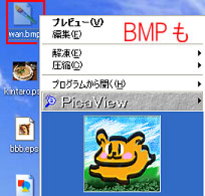 PicaView 2.0Jをインストールすると画像ファイル上でを右クリックするだけで、メニューに画像のサムネールが表示され、クリックするとプレビューできる、それがまた、表示までがとっても早いんです。