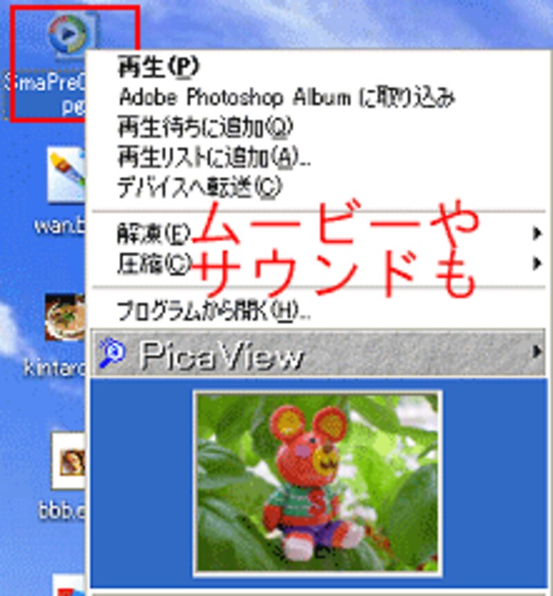 このプレビューでは、BMP、GIF、JPEGといった一般的な画像ファイルはもちろんのことですが、GIFアニメはアニメーションの状態でプレビュー、また「WAV」「MP3」や「MPEG」などのビデオやサウンドファイルもプレビューすることができます。フォトストーリーのWMV形式も再生することができました。