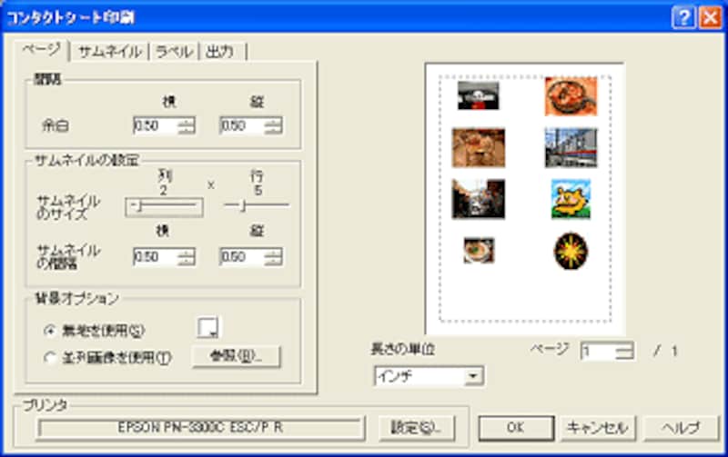 「サムネイルのサイズ」で表示する(印刷する)サムネイルの列と行数を設定して、プリンタの「設定」で用紙や品質を選択して「OK」をクリックするだけで、コンタクトシートがあっという間に印刷できます。