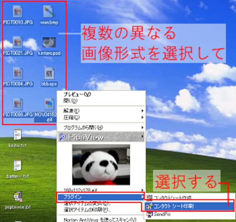 画像ファイルひとつに限らず、たとえば複数の異なる形式のファイルを選択して、右クリックでコンタクトシートが作れるのです。