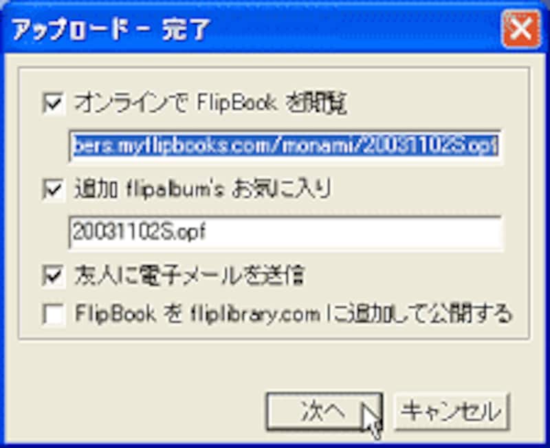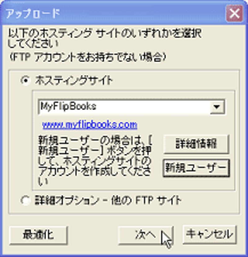 アップロードはとても簡単で、[ファイル]→[Webへアップロード]を選び、[ホスティングサイト]の「MyFlipBooks」の[新規ユーザー]でまず登録を行った後、[次へ]ボタンをクリックして進めると、アップロードが開始します。