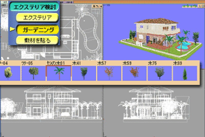 家の外装、内装が整ったら、外回りの設定を行います。[エクステリア][ガーデニング]で思う存分庭造りをたのしみ、[敷材を貼る]で敷地一面芝生にしたり、石畳などを敷き詰めます。