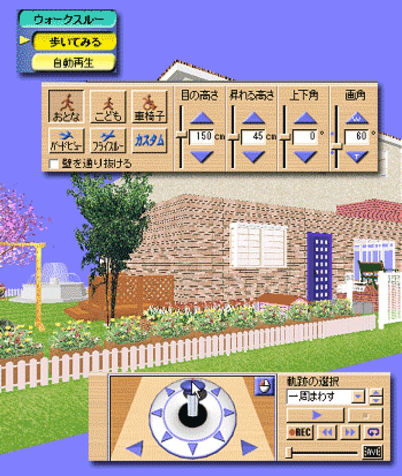 家の周りも、家の中もゆっくり歩きながら、じっくりあなたの目線で確認します。目の高さや顔を上げ下げ、左右に振ったときの視線も随時調節しながら、ジョイスティックボタンやまたはマウス操作で任意の方向に前進や後退を行います。