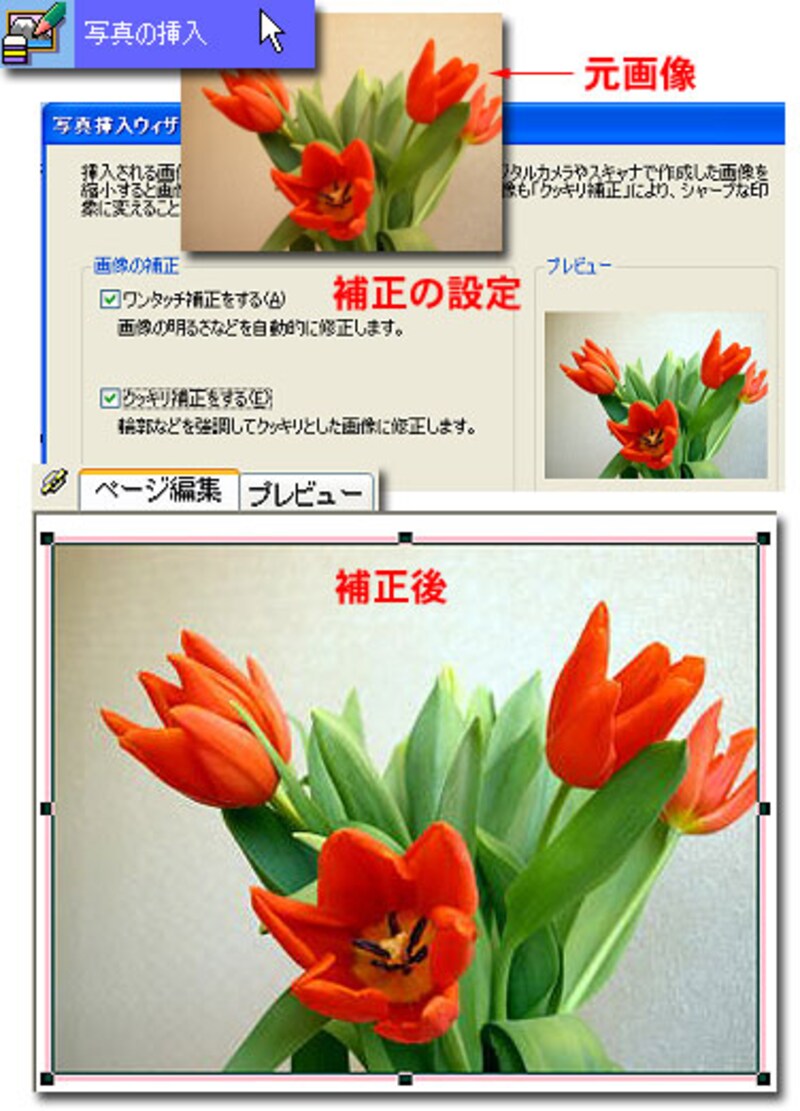 [画像挿入のウィザー]ドでは、画像の90度回転や、適したサイズの設定、自動の明るさ、くっきりとさせる補整など、それぞれワンタッチで行います。