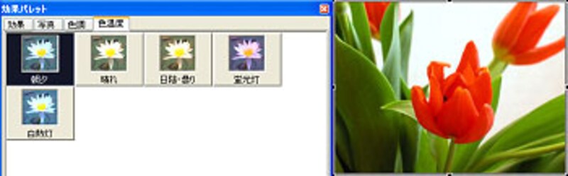 本格的に画像を加工する機能も備わっています。[ウェブアートデザイナーで編集]を選ぶと、撮影時の光の種類による画像の色温度を修整したり、色調や鮮やかさの調整を行います。これらの効果はオプションで手動による適用度の詳細設定が可能です。自動や初期設定の効果では納得のいかない場合にはここで調整を行うことで、ほとんどの画像の改善が可能です。