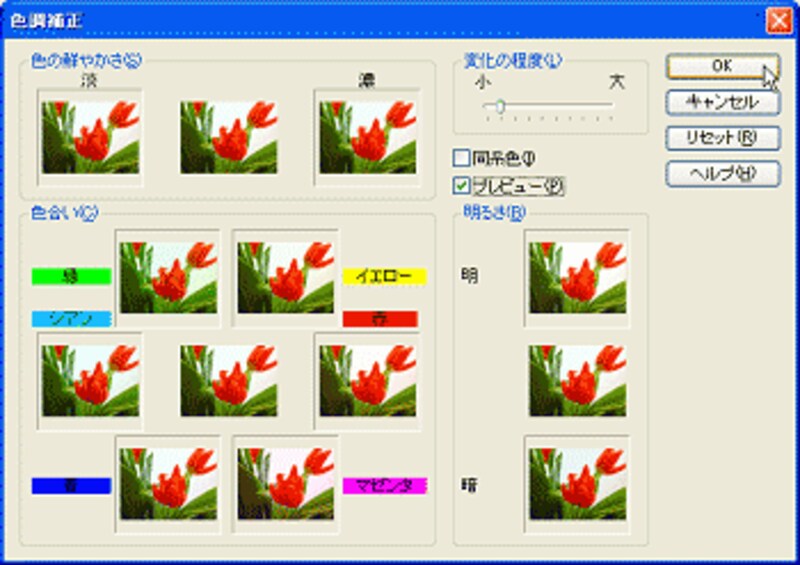 ▲「色合い、鮮やかさ、明るさ」をひとつの画面で調整できます