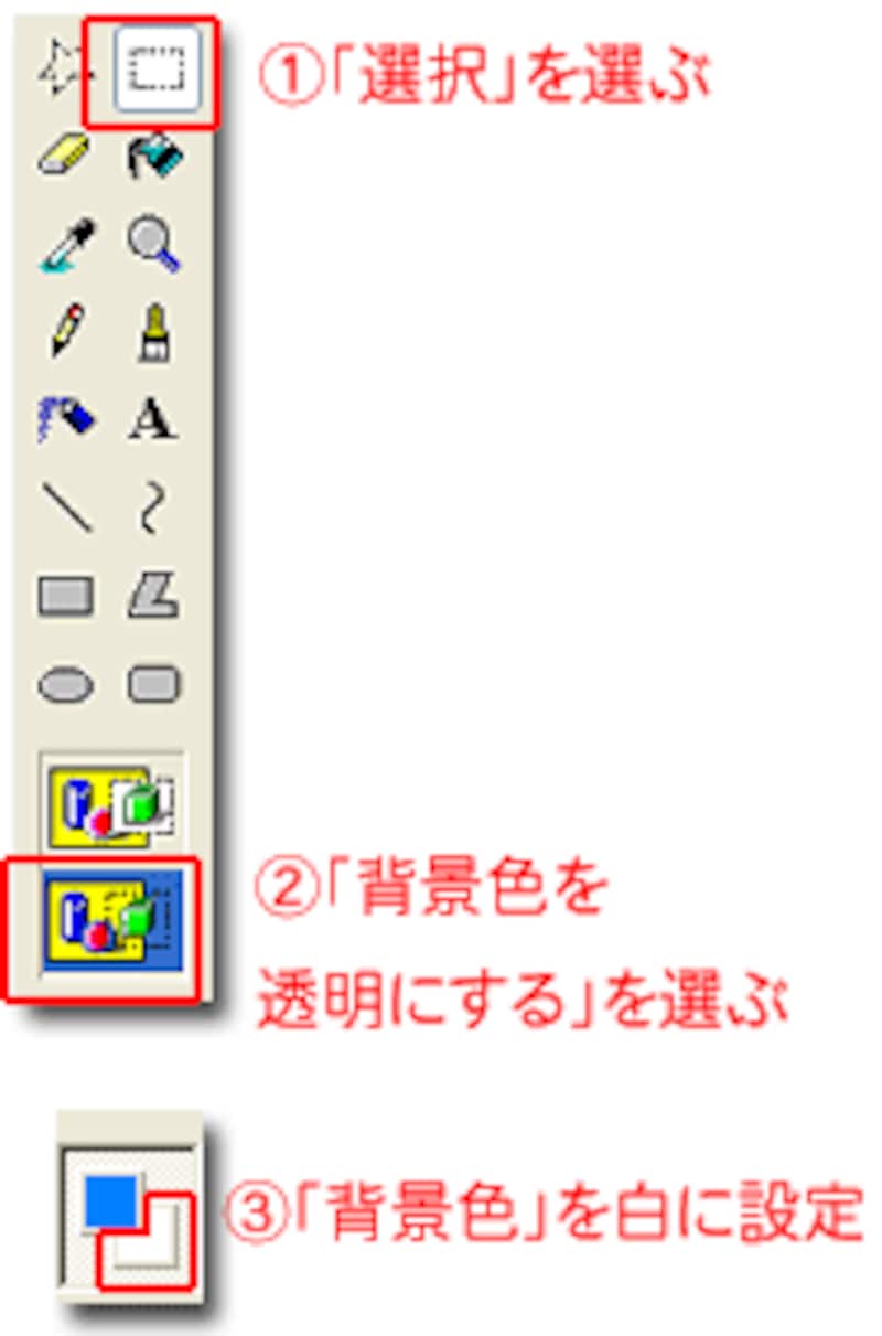 ツールボックスで「選択」を選び、その下にある「背景色を透明にする」をクリックします。