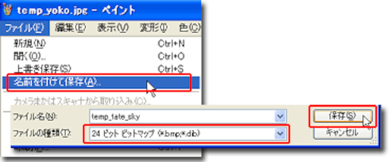 ここではファイルの種類を「24ビット ビットマップ(*.bmp)」にして保存をしておきます。