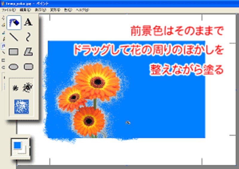 先ほどの台紙を塗りつぶした色が前景色に設定されているかどうかを確認し、花の周りをドラッグしてぼかしを整えます。