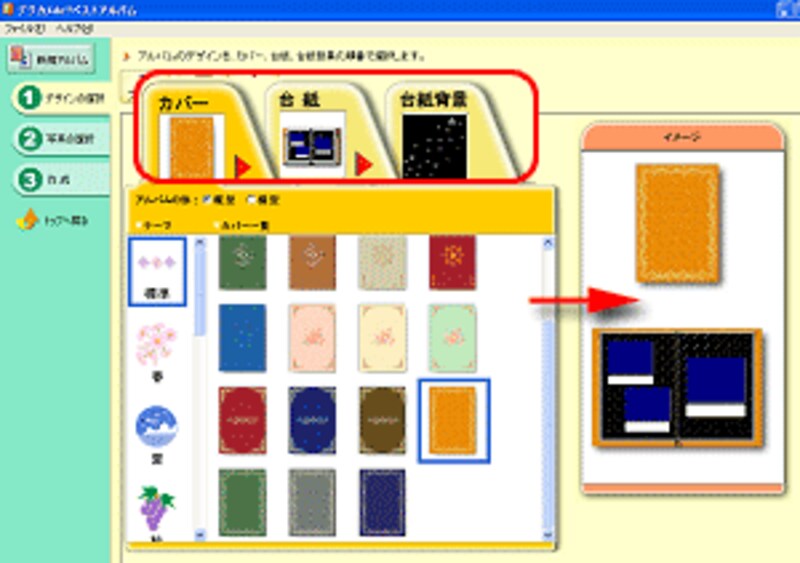 「新規アルバム」で「カバー」「台紙」「台紙背景」の各デザインからテーマを選び、好みのデザインを選択します。右側にイメージにプレビューが表示されます。