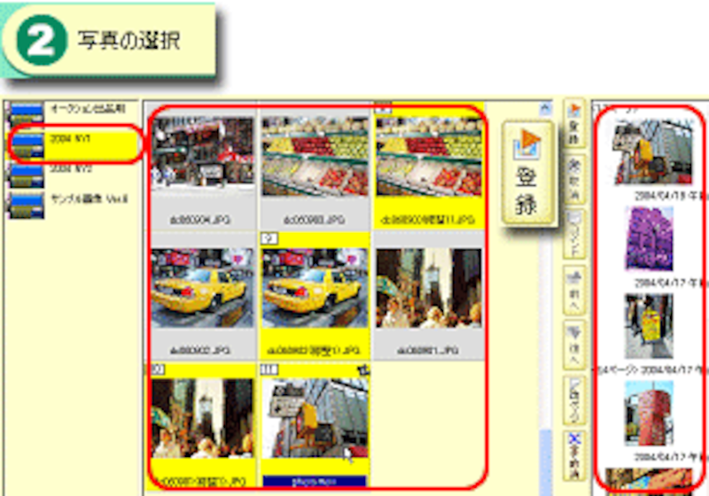 デザインができたら、アルバムに差し込む写真を選択します。「デジカメde!!同時プリント8」と同じ要領で、フィルムから写真を選択して、「登録」ボタンをクリックすると右側にアルバム用写真として登録されます。