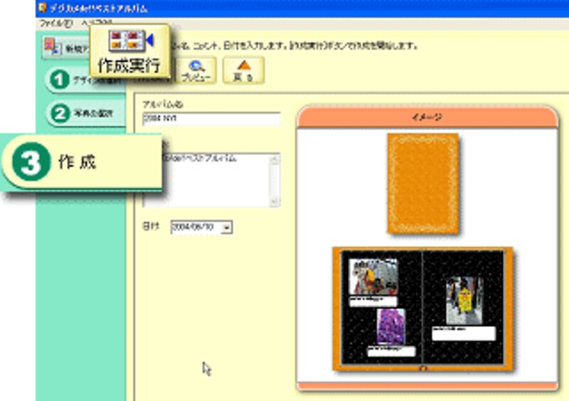 これで「作成」に進み、「作成実行」ボタンをクリックすると、あとは自動的にレイアウトされて、基本的なアルバムはこれでできあがってしまいます。
