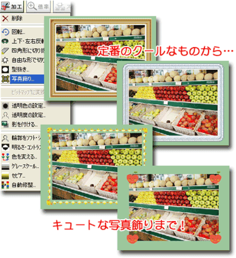 また、写真を飾る枠も、クールなものから、キュートなものまで楽しく選ぶことができます。アルバムのテーマに合ったデザインで統一したり、写真一枚一枚にこだわって変えてみたり、ときにはかわいいイラストで写真の四隅を飾るなど、枠で写真やページのイメージを変えてみるのもおもしろいかもしれません。