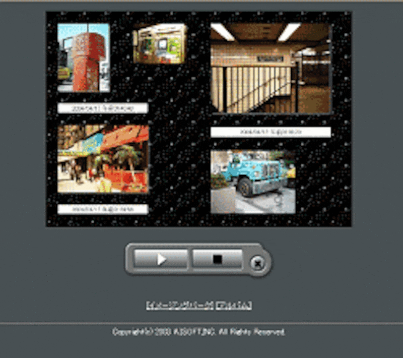できあがったアルバムは、「ビューワ」ボタンをクリックすると開くウィンドウで、好みの音楽付きのアルバムのページをめくったり、スライドショーで楽しく観ることができます。