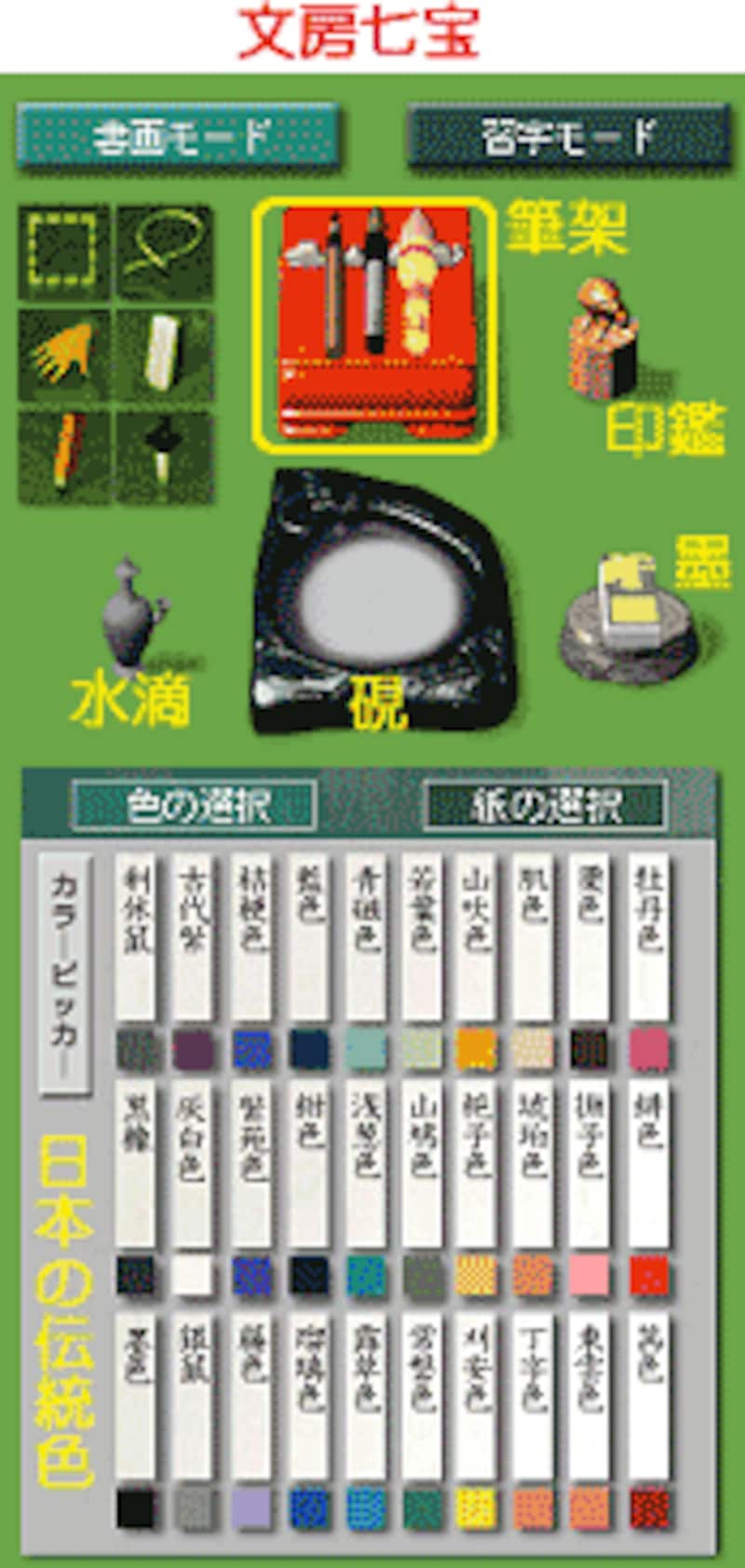 墨といっても黒一色だけではありません。文房七宝の下には「カラーパレット」ならぬ「日本の伝統色」が、なんと30色も配列されています。和を感じさせる配色は、どれも使ってみたいものばかりです(色の名前を初めて知ったものも)。