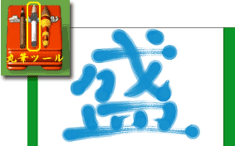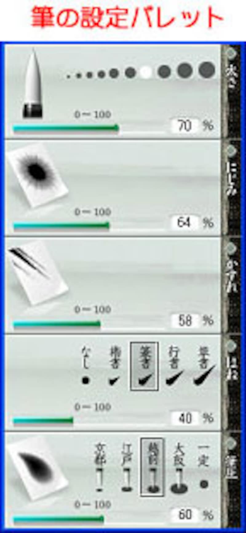 書道の一般的な筆で描くには「書道筆ツール」を選びます。筆の効果を「筆の設定」パレットで設定しますが、その方法にはとてもユニークなものがあります。