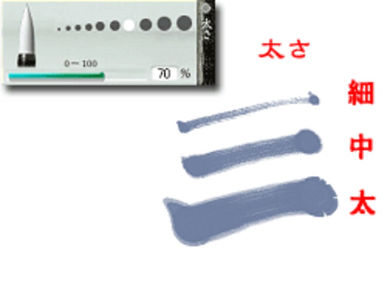 「太さ」は極細から極太まで、筆の太さを調整します。