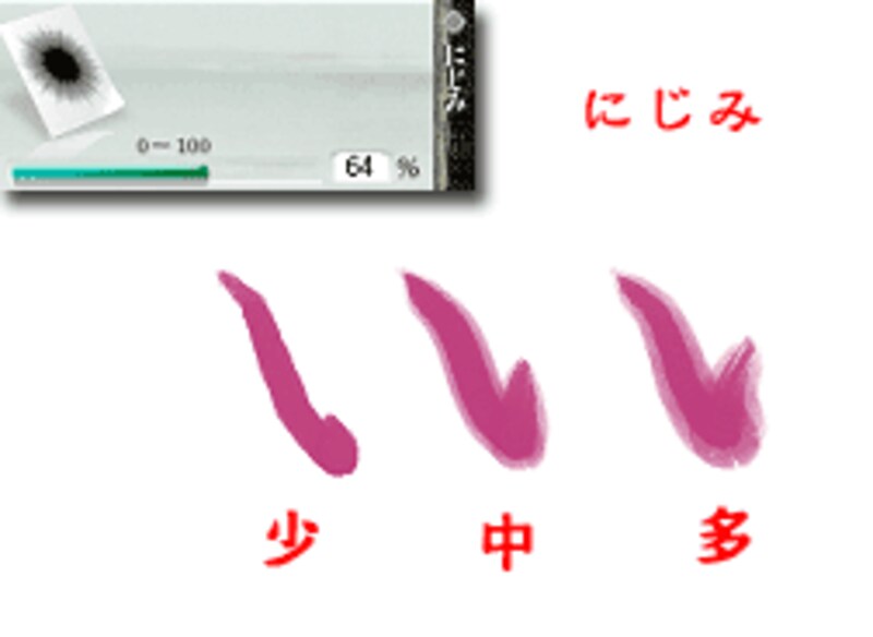「にじみ」は中心が濃く、周りが水を含んでじわ~っとにじむ感じを少なく出すか、多く出すかを調整します。