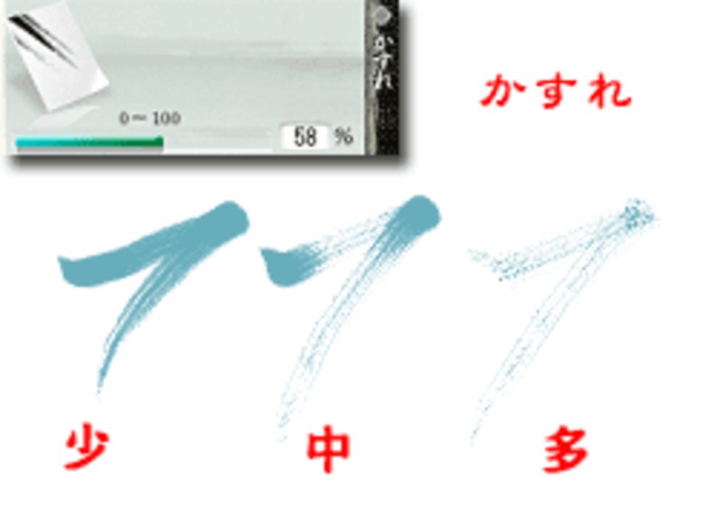「かすれ」は墨の量、筆の勢いによって生じるかすれの程度を調整します。かすれ効果が少ないとしっとりと墨を含んだ筆線が、かすれ効果が多いと墨の量が極端に少ない筆で書いた感じになります。