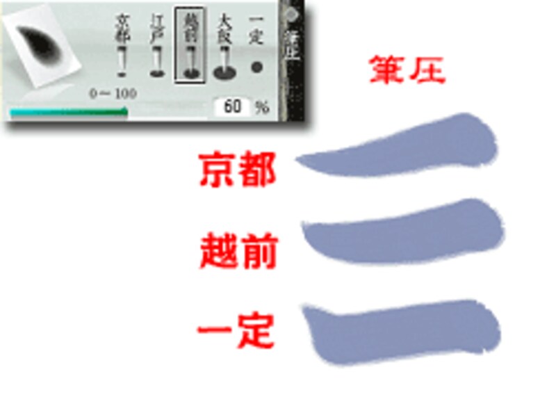 「筆圧」はマウスボタンによる最初の押さえが太くなっていく速度を設定します。「京都」は太くなる速度が一番遅く、「江戸」「越前」「大阪」と順に早く太くなり、「一定」ですと、最初の押さえの直後から太くなります。
