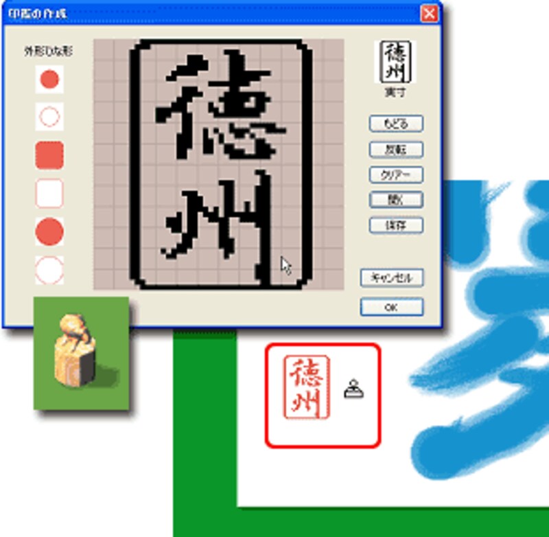 「印鑑」をダブルクリックすると、「印鑑の作成」ダイアログボックスが開きます。ここでいわゆるドット絵や外字を作る要領で、オリジナルの印鑑を作成して、ビットマップ形式で保存しておき、必要なときに開いて何度でもぺたぺた押して活用できます。