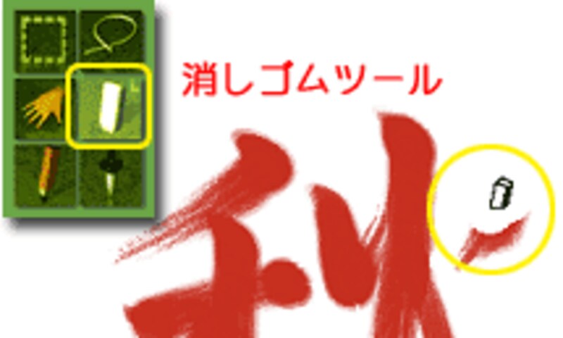 また、「消しゴムツール」で文字をドラッグすると、当たり前ですが消せます。とはいえ紙に墨で書いた文字では不可能なこともできてしまうのには…書道で苦しまれた経験のある方なら、少なからずこの機能には驚くのではないでしょうか…。私は思わず「エー!?消してもいいの?」と叫んでしまいました…失敗した部分も消してやり直せる。ああ、ありがたい機能です(涙)。