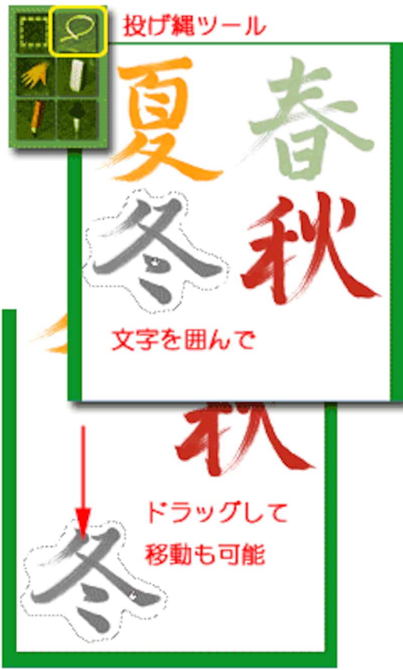 CGソフトではおなじみの選択するためのツール、たとえば「投げ縄ツール」がなぜかあります。これを利用しない手は無いでしょう。ということで、一度書いた文字を選択し、ずずーっとドラッグして、文字の配置を調整するといったこともできるわけです。