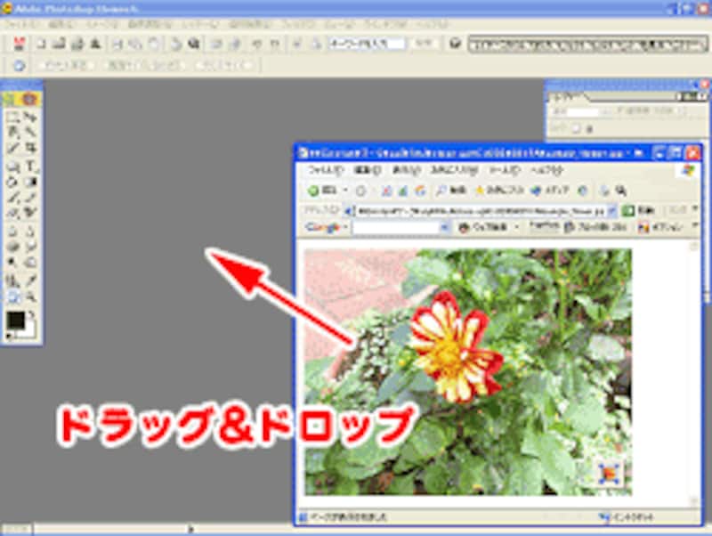 Photoshop Elements2.0を起動させて、下の小さな画像をクリックすると開く大きな画像を、Photoshop Elementsの作業エリアへドラッグ&ドロップしてます。