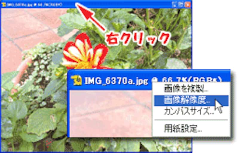 開いた画像のタイトルバーの上で右クリックします。表示されるリストから「画像解像度」を選びます。
