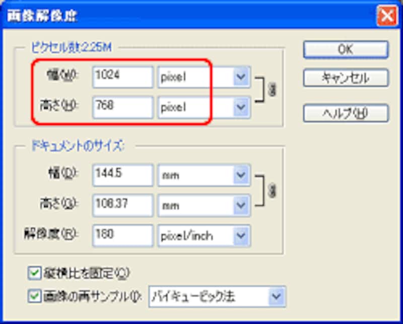 | <POINT> ハガキを横置きにした場合の幅と高さは148mm×100mmが通常の大きさになります。 またちょっと難しい話になりますが、ハガキに写真をある程度きれいに印刷するためには、「解像度」が「300pixel/inch」必要になります。ここでは絵画風にアレンジするため、さほど解像度は難しく考えず、今回は「150pixel/inch」以上の解像度があれば十分です。 |