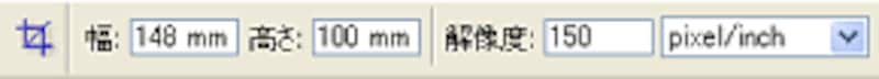 切り抜く手順はいたって簡単です。ツールボックスの[切り抜きツール]を選びます。オプションバーで「幅」を「148mm」、「高さ」を「100mm」に、「解像度」を「150」「pixel/inch」に設定します。