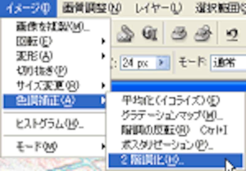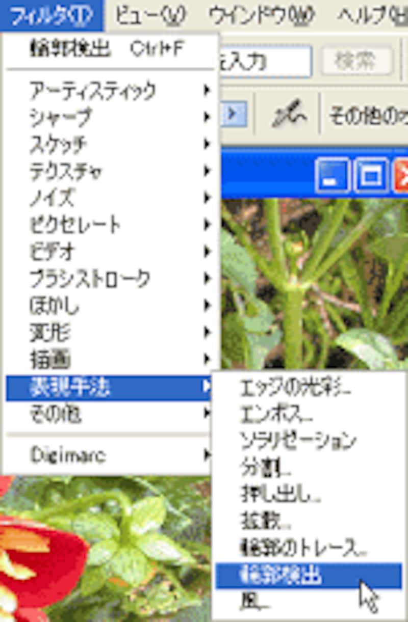 メニューバーの[フィルタ]→[表現手法]→[輪郭検出]を選び、続いて[イメージ]→[色調補正]→[2階調化]を選びます。