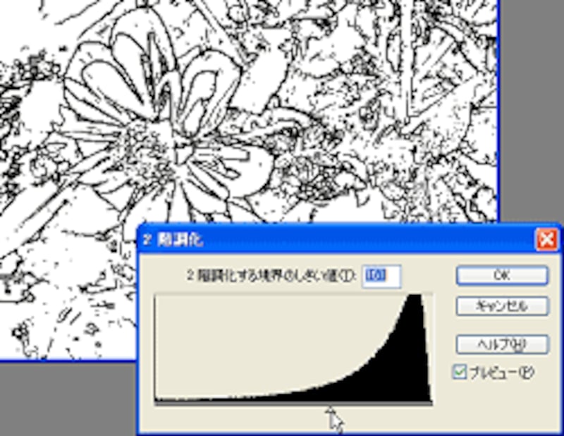 画像の輪郭が黒く、それ以外の部分が白く変換されますので、ダイアログボックスのスライダーをドラッグして、輪郭の線と白い部分とのバランスが良いように調整して、[OK]をクリックします。