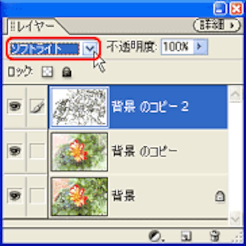 白黒化された「背景のコピー2」レイヤーを選択した状態で、「レイヤーの描画モードを設定」を「ソフトライト」に変更します。すると輪郭の線が適度に強調され、色が淡く、水彩で色づけたような印象に変わります。
