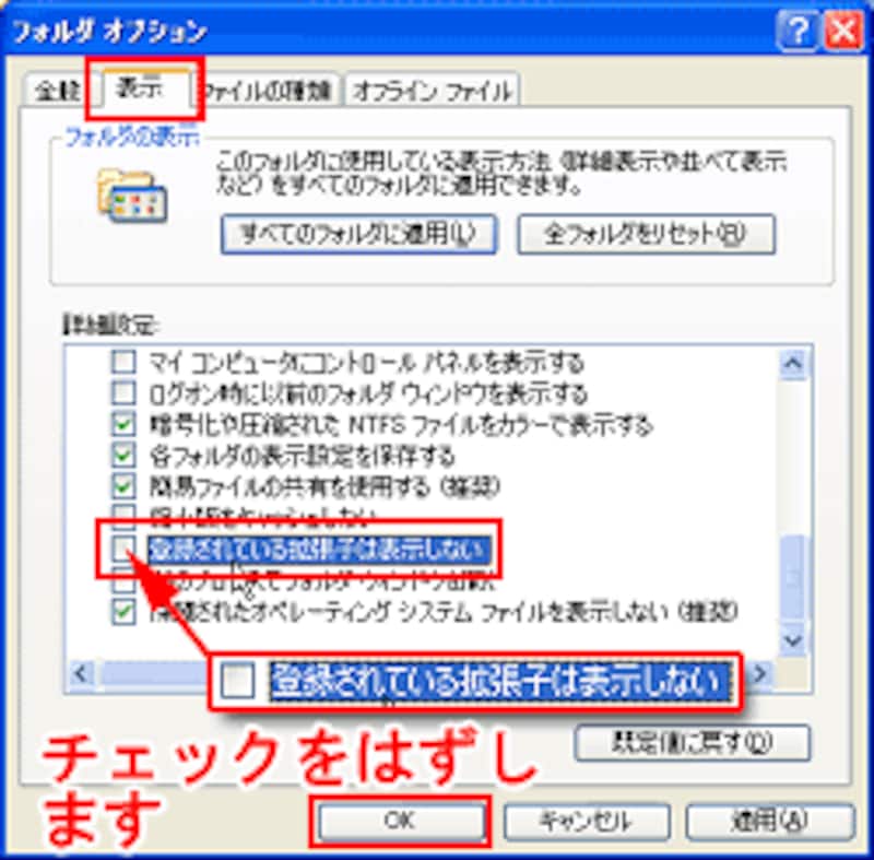 [表示]タブをクリックして開き、「詳細設定」で「登録されている拡張子は表示しない」のチェックをはずし、[OK]をクリックします。