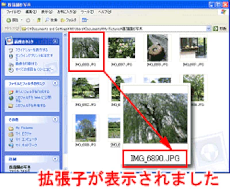そこで画像のファイル形式が一目でわかるように、「画像ファイルの拡張子」を表示させてみます。